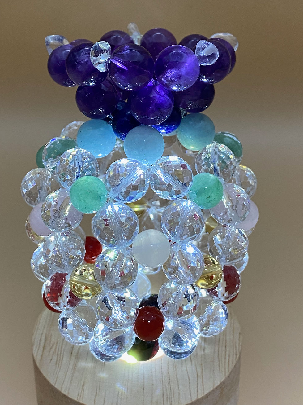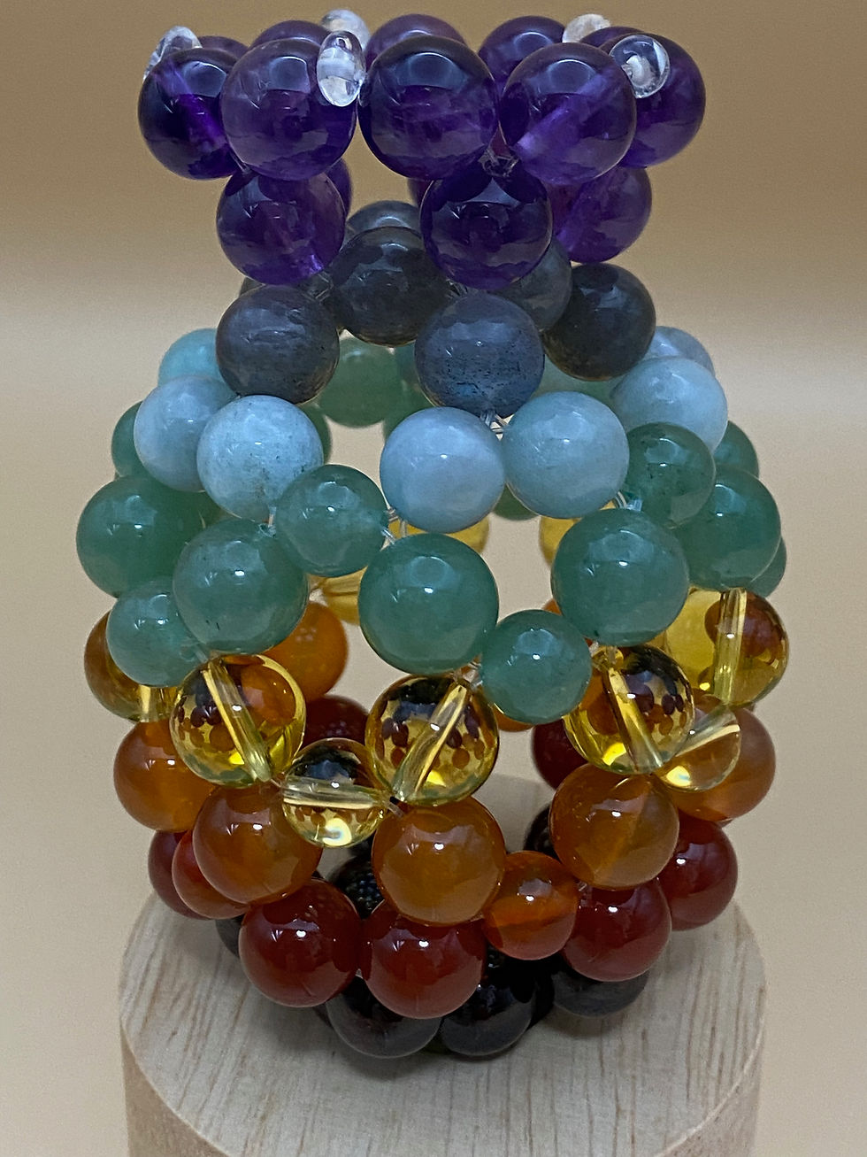 An intricately woven pineapple-shaped bead creation, adorned with a spectrum of colors representing the numerous chakra energies. This unique masterpiece serves as a captivating and symbolic focal point for personal meditation, aligning the chakra colors to promote balance, harmony, and spiritual alignment. As the beads intertwine in the shape of a pineapple, it invites a sense of tropical tranquility, grounding the meditator and fostering a connection with both the vibrant energy of the chakras and the serene essence of a tropical retreat.